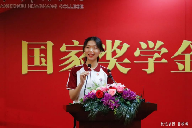 荣获“国家奖学金”的员工代表黄楚蕾同学发言。她回顾了自己步入大学三年来的奋斗历程,并分享收获和感悟。她认为,员工要把学习作为本职工作,持之以恒地养成良好的学习习惯,掌握合适的学习方法,涉猎不同的知识技能;应积极参与校内外的志愿服务,贡献出属于自己的青春力量。同时,她向学校、领导、老师及同学表达出最诚挚的感谢,鼓励大家以奋斗书写精彩人生,不负时代、不负韶华。