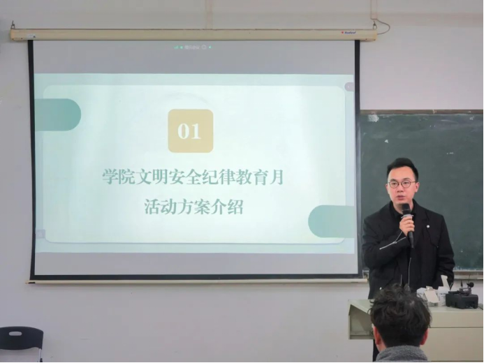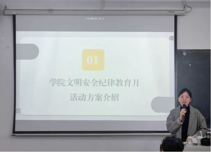 大会伊始,刘龙真老师根据学校教育月文件精神,介绍了学院文明安全纪律教育月活动的方案。刘龙真老师重点介绍了本次纪律教育月活动的总体安排,主要分为工作部署、宣传动员、检查落实、总结表彰四个阶段,就各阶段的具体工作安排进行了详细的介绍,并强调了各员工组织和各班级需根据方案的具体内容严格执行和落实。